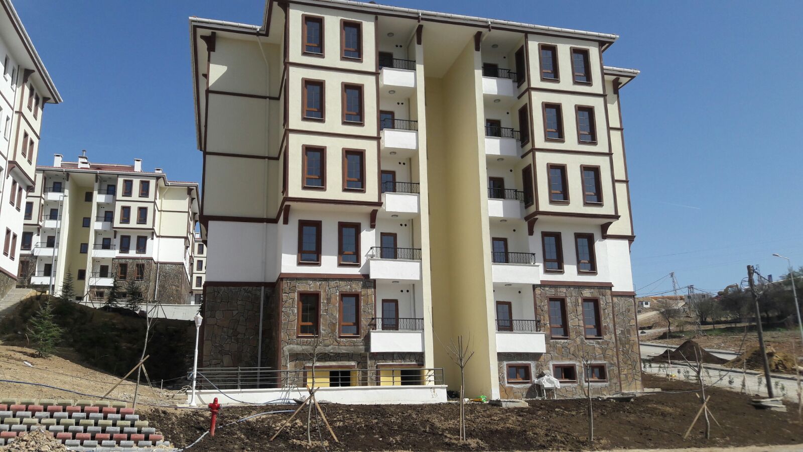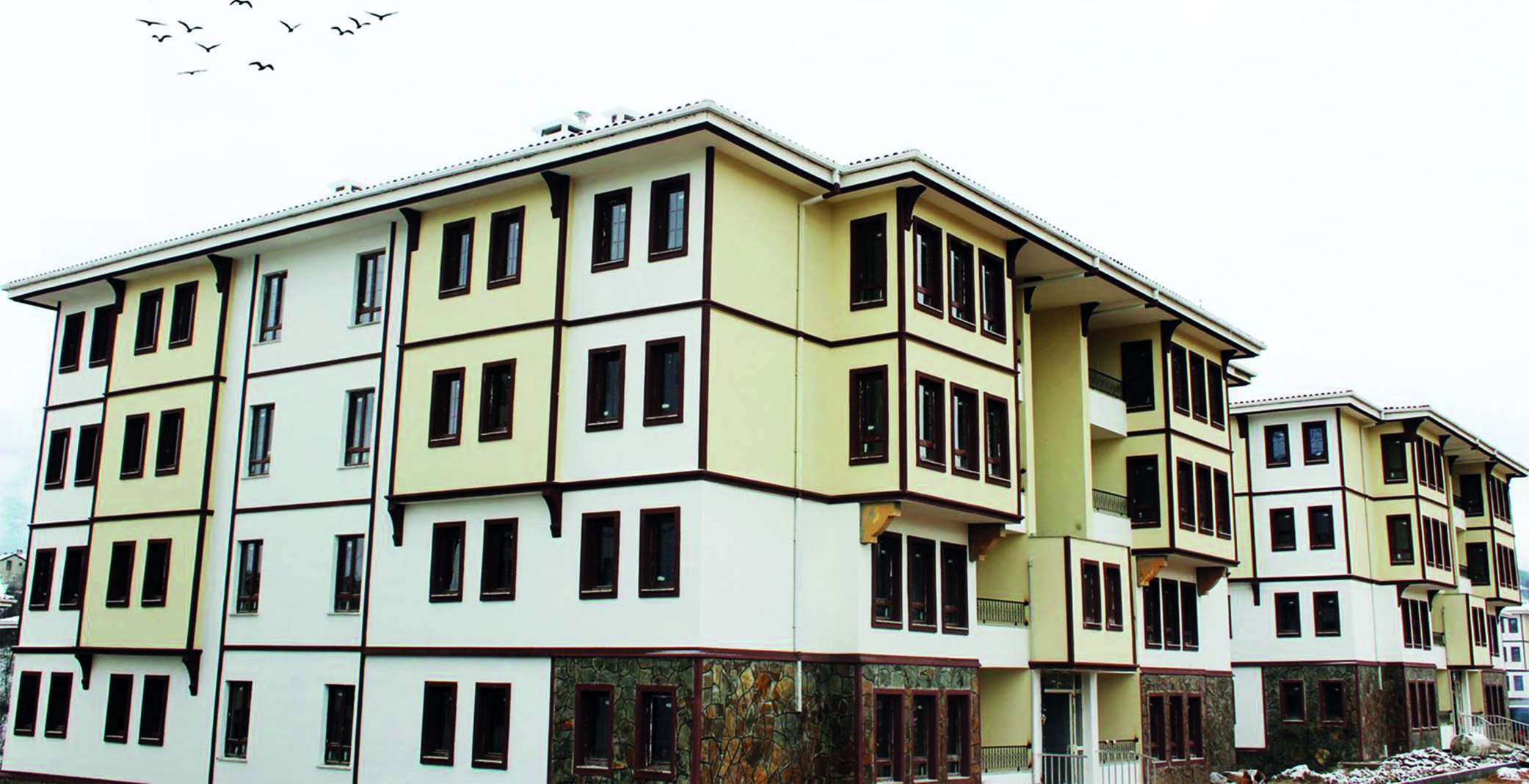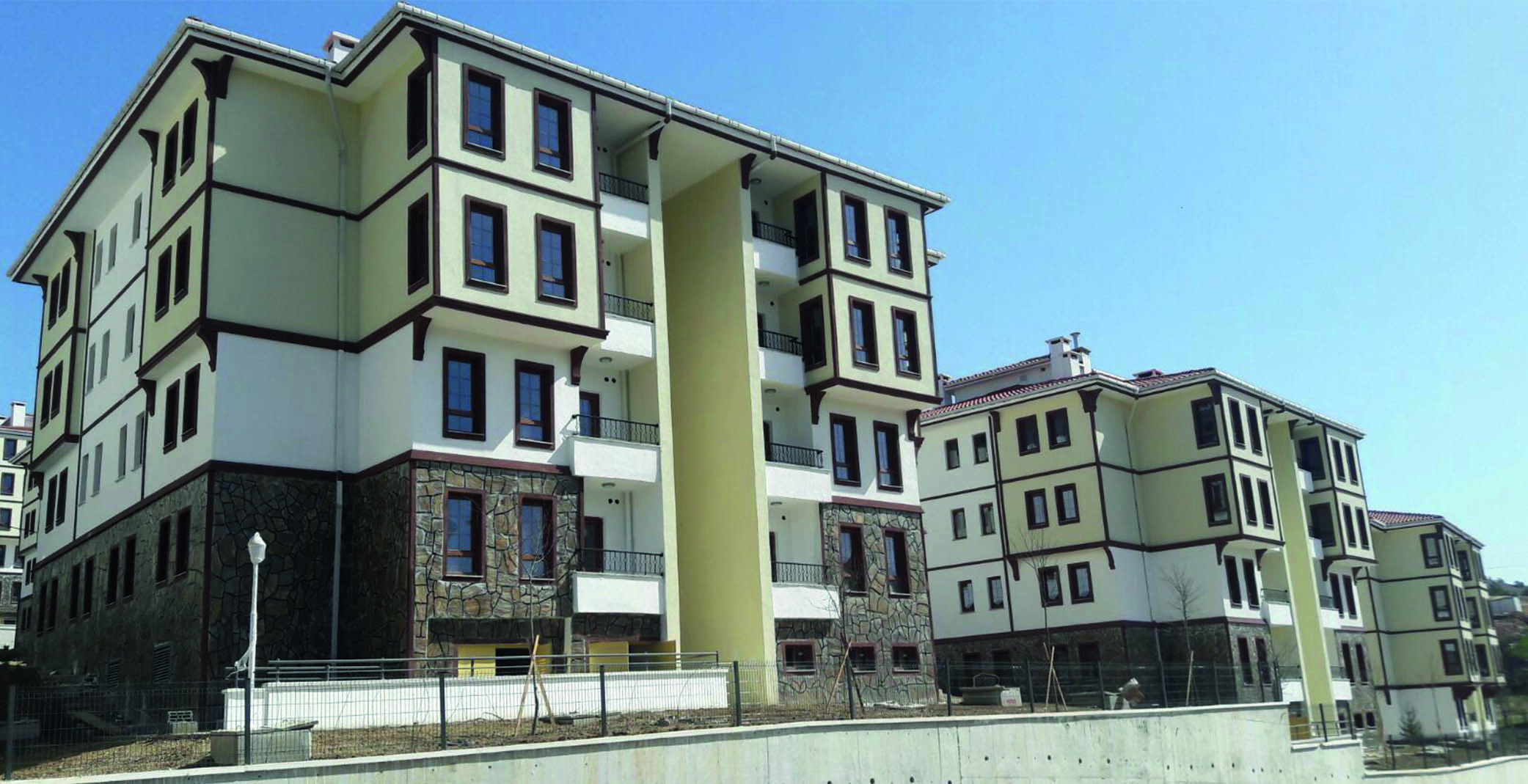 The project involved the construction of 579 residences, and one Commercial Center in the Safranbolu district of Karabük. The total construction area spans approximately 78,000 m2. The residences, built using the tunnel formwork system and featuring a ground + 3-story height limit, include 417 units in a 2+1 layout and 162 units in a 3+1 layout. The Commercial Center was built using a conventional formwork system. A strong emphasis was placed on aesthetics and community design, creating a central courtyard layout for blocks to enhance pedestrian flow, traffic, function, and aesthetics. The façade design meticulously adheres to traditional Safranbolu architecture, featuring wrought iron railings, local stone cladding, decorative jambs, buttresses, and wood-look eaves. The unique narrow, elongated windows and cantilevered elements ("çıkmalar"), typical of Safranbolu houses, break the monotony of the block exteriors. Importantly, 80% of the project area is dedicated to landscaping, which includes children's play areas, outdoor sports and seating areas, walking paths, groves, and open parking.